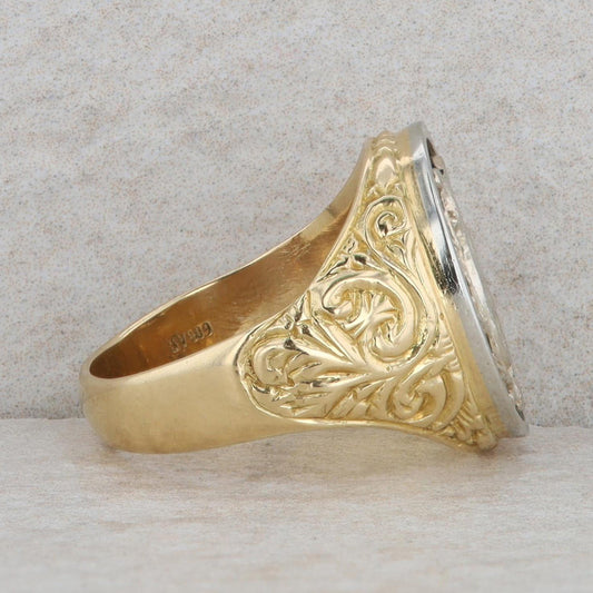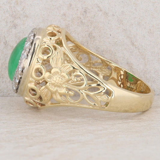 14k Yellow Gold Oval Cabochon Jade & Diamond Cluster Filigree Ring