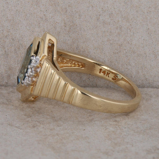 14k Yellow Gold Elongated Hexagon London Blue Topaz & Diamond Textured Ring