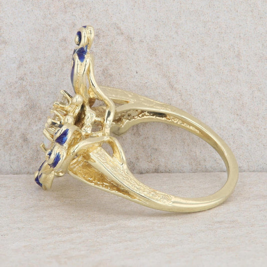 14k Yellow Gold Heart Opal & Diamond Blue Enamel Butterfly Ring
