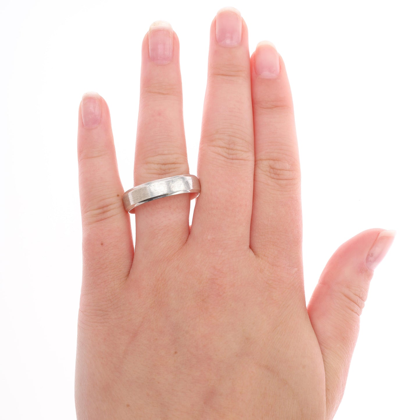 This men's sterling silver ring has one round brilliant cut diamond that is prong set into the center of the ring. It measures approx 0.03ct and is H-I in color, I2 clarity. The ring measures 5.9 mm in width and weighs 4.8 grams. The finger size is 13. The ring has some scratches from wear but the band has been polished and cleaned to the best of its ability; it was checked by experienced jewelers.